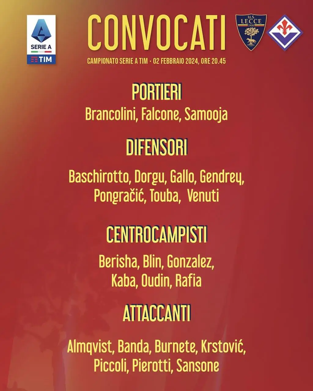 LECCE - Sono 23 i convocati di D'Aversa per questo Lecce-Fiorentina in scena questa sera alle 20.45 al “Via del Mare”.