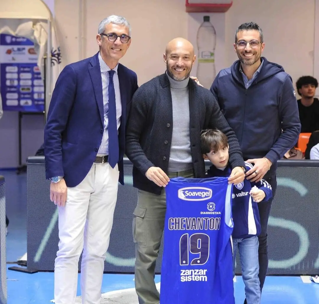 A portare fortuna sugli spalti e anche a bordo campo con la dedica di una maglia speciale l'ex Lecce Ernesto Javier Chevanton, festeggiato dalla dirigenza della VALTUR Brindisi con la sua maglia 19.