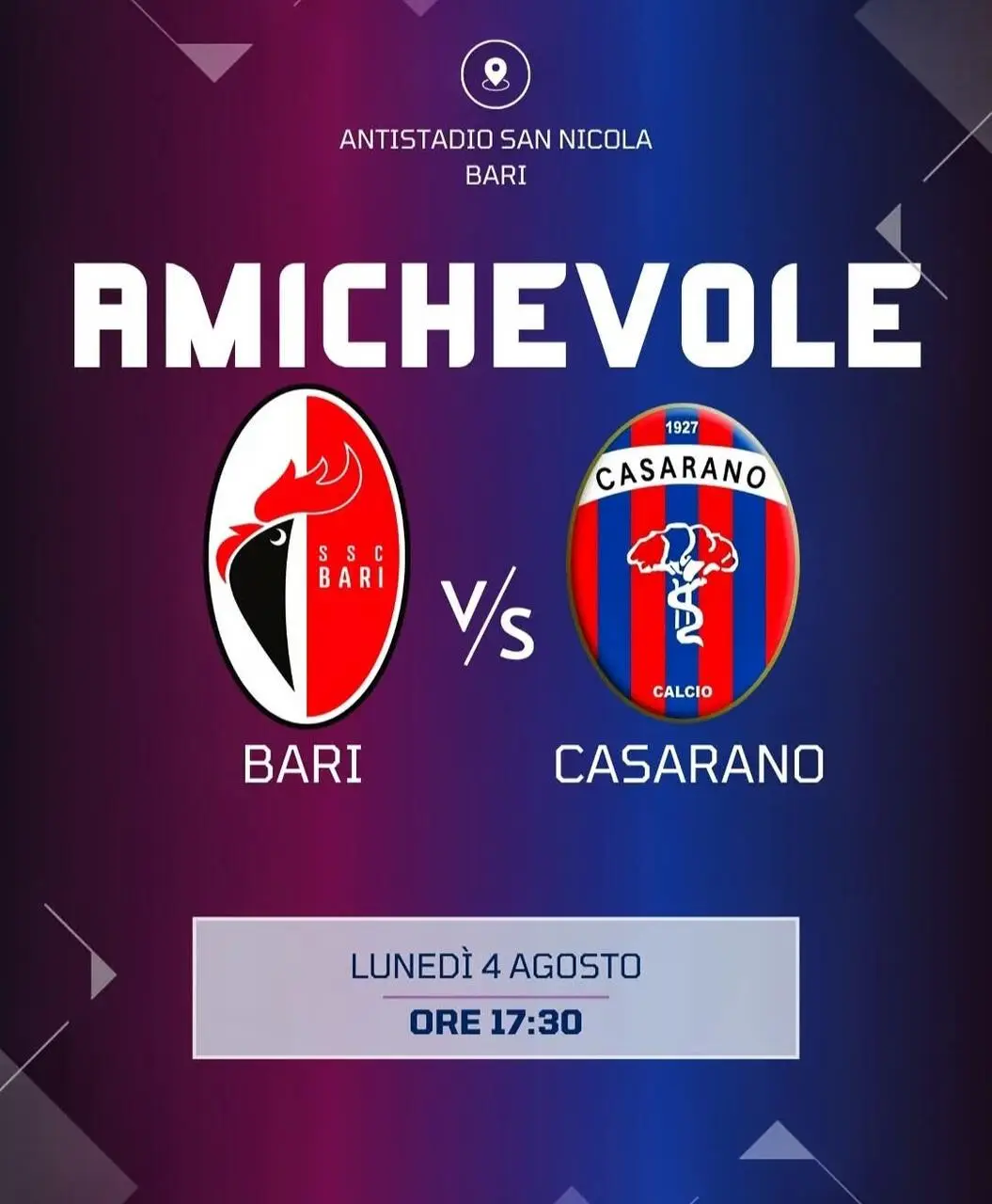 CASARANO - Appuntamento lunedì 4 agosto alle 17.30 all'Antistadio del “San Nicola” di Bari.