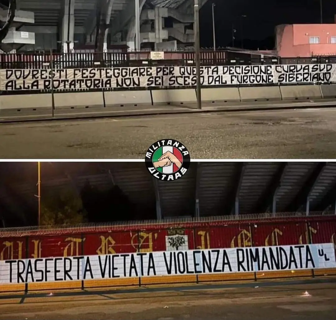 Si è consumata a distanza, la “guerra” degli striscioni che la pagina ultras “Militanza Ultras” ha efficacemente riepilogato in queste ore sui social, con un post fotografico che riassume le due posizioni assunte dai due gruppi ultras.
