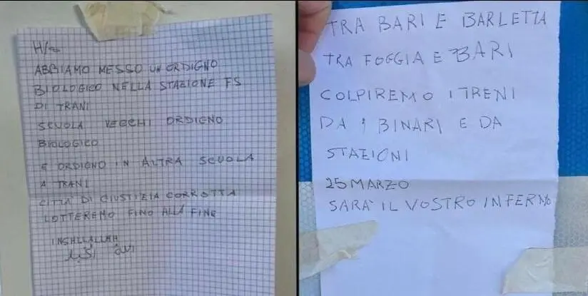 Le due lettere, affisse in punti diversi della Stazione di Trani, scritte in un italiano piuttosto approssimativo, indicano la presenza di ordigni biologici lungo la linea ferroviaria e nelle scuole di Trani.