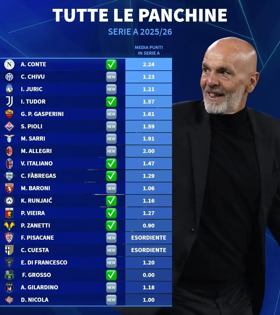Questo senza contare che ci sono 2 esordienti assoluti sulle panchine del massimo campionato, Cuesta al Parma che viene dal mondo degli allenatori in 2°, dei Vice come si dice in tempi moderni, e Pisacane che arriva dal settore giovanile del Cagliari.