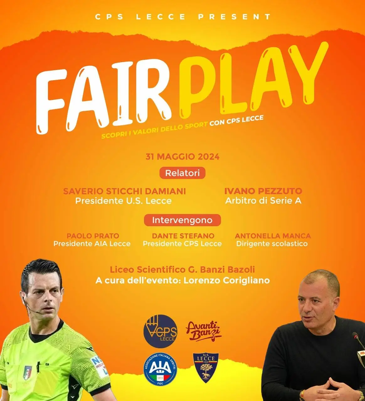 Interverranno anche Paolo Prato, Presidente degli arbitri leccesi, Dante Stefano, Presidente del CPS Lecce, la dirigente scolastica del “Banzi” Antonella Manca e l'organizzatore dell'evento Lorenzo Corigliano, arbitro in forza alla Sezione AIA di Lecce ma anche studente del “Banzi”.