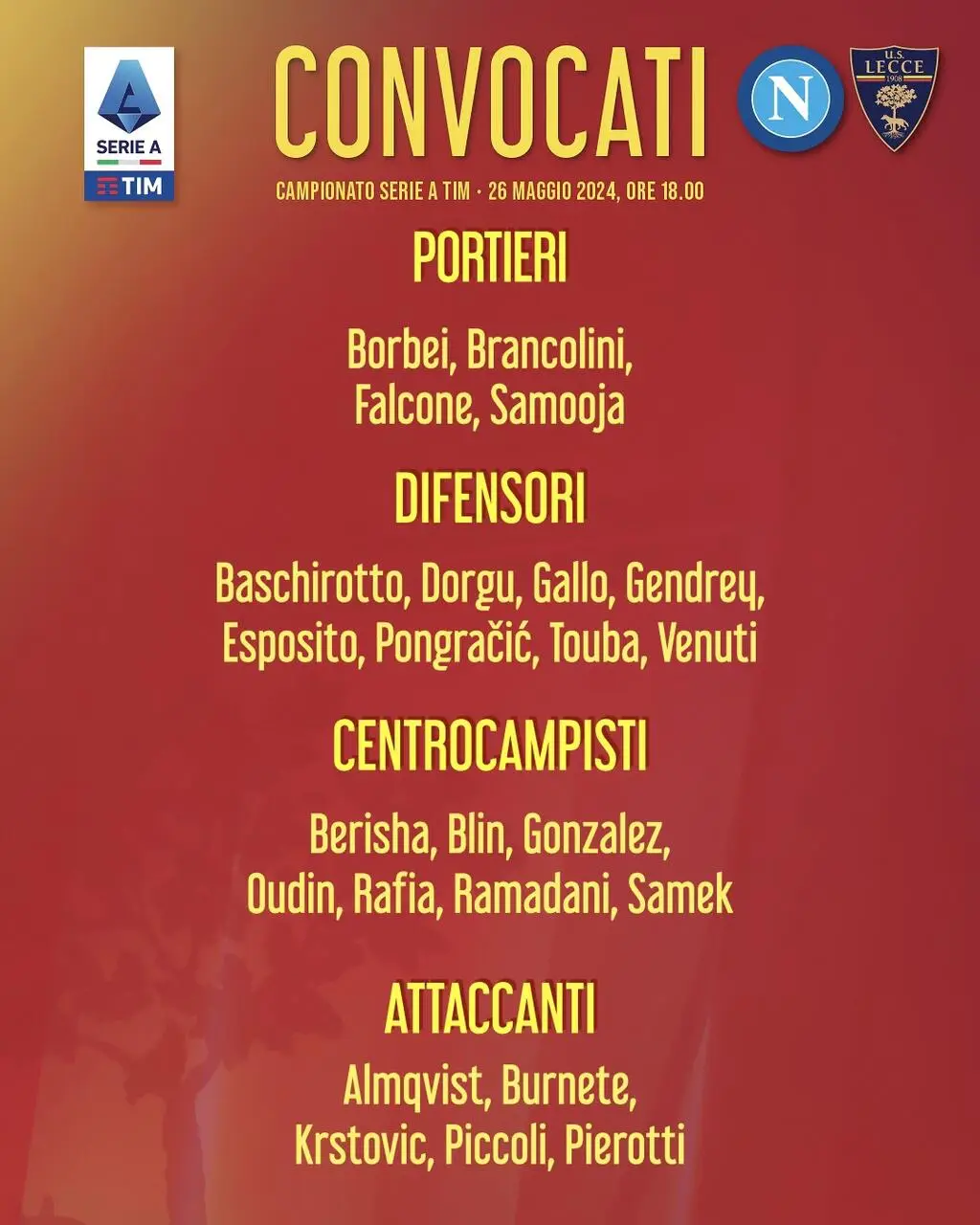 Per Napoli non partono gli infortunati di lungo corso Dermaku, Kaba e Banda, come Sansone, che ha saltato questo finale di campionato fortunatamente ininfluente per un problema al soleo destro.