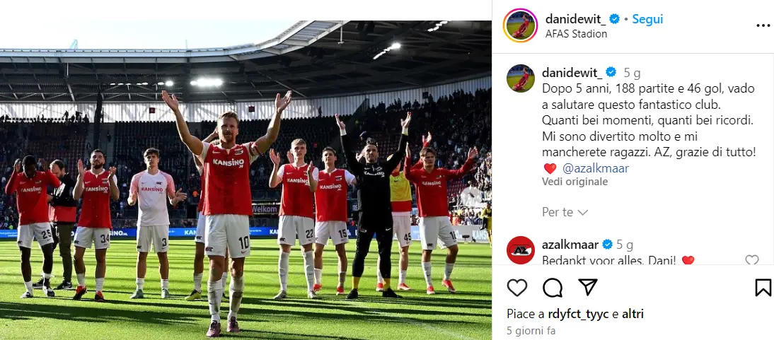 Dani De Wit è uno svincolato, il numero 10 dell'AZ Alkmaar ha deciso di non rinnovare il suo rapporto contrattuale in scadenza con il club olandese dove ha speso 5 anni della sua carriera, con 188 partite e 46 reti.