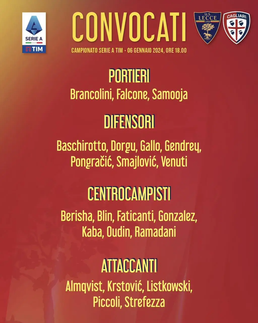 LECCE - Sono 22 i convocati di D'Aversa per questo Lecce-Cagliari di domani al “Via del Mare” a partire dalle 18, nella calza della Befana dei tifosi giallorossi.