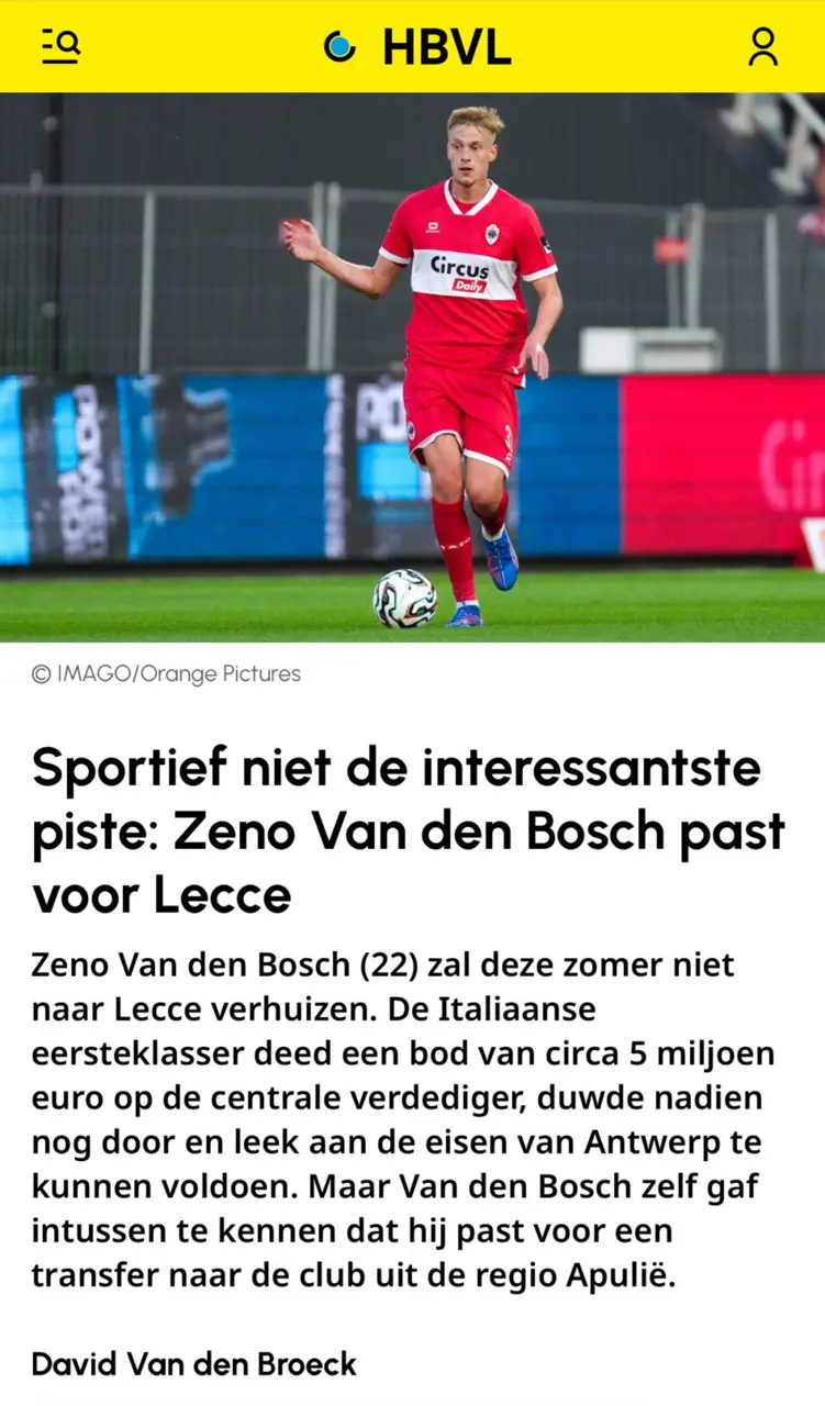 ANVERSA - Zen Van Den Bosch ha detto “no”, per la stampa belga “non prende in considerazione l'ipotesi Lecce, dalla sua carriera chiede di più che una squadra della zona salvezza italiana che probabilmente non è disponibile neppure a fargli fare un salto di qualità economica”.