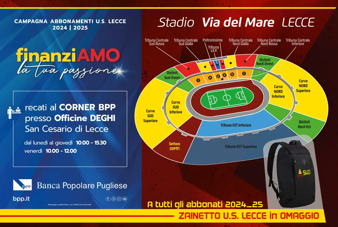AI suoi abbonati che rinnoveranno fiducia nella società e nel gruppo in costruzione per la prossima Serie A sarà omaggiato lo zainetto ufficiale da trasferta e da passeggio dei calciatori e dello staff del Lecce, quello che tantissimi dei nostri lettori avranno visto sulle spalle dei giallorossi arrivando al “Via del Mare” o scendendo dal pullman in trasferta.