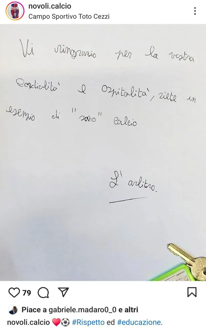 Non appena scoperto il messaggio lasciato dall'arbitro leccese il Novoli l'ha postato sui social ufficiali, dove questo bel momento di calcio è rapidamente diventato “virale” (FOTO SOTTO).