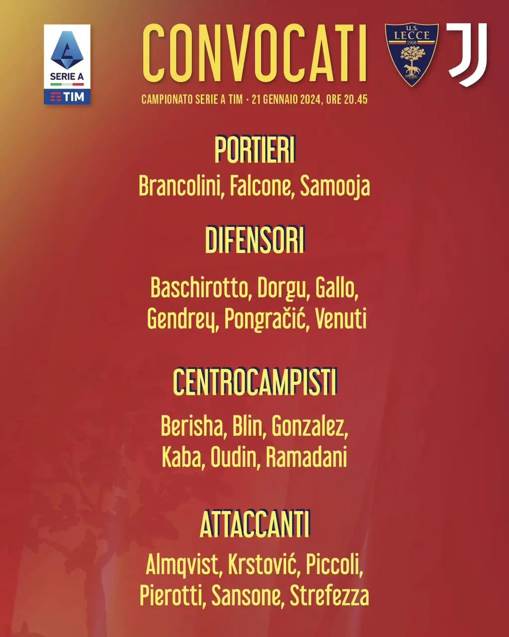 LECCE - Sono 21 i convocati di D'Aversa da questo pomeriggio in ritiro in un albergo cittadino in vista di Lecce-Juventus di domani alle 20.45 al “Via del Mare”.