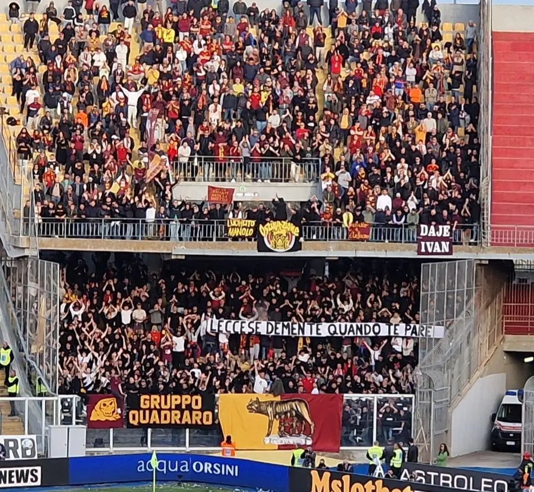 Intanto i tifosi romanisti hanno esibito comunque il loro striscione preparato con cura a casa ed esibito al “Via del Mare” nel settore Ospiti, e che vedete nella foto sopra.