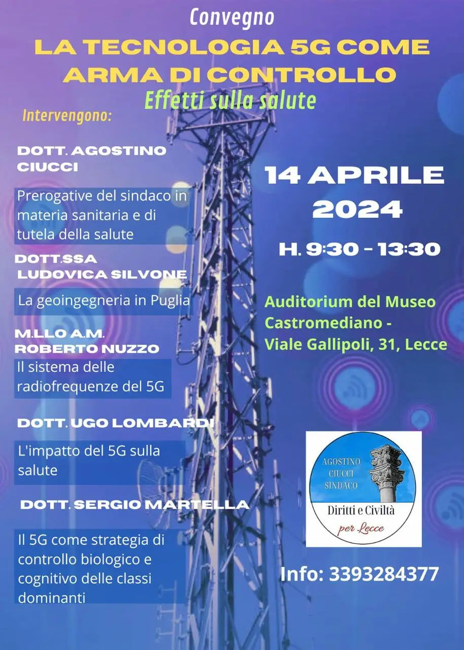 Se ne parlerà domenica dalle 9.30 alle 13.30 nelle sale del Museo “Castromediano” di Lecce nel corso di un convegno voluto dalla lista civica “Diritti e civiltà per Lecce”: il convegno è incentrato proprio sul grande allarme della nostra modernità, “la tecnologia 5G come arma di controllo. Gli effetti sulla salute”.