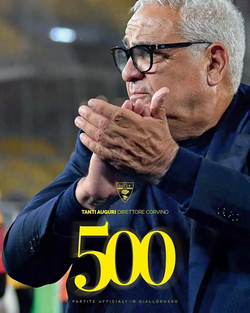 Parla Pantaleo Corvino, che il Lecce con una grafica prima di Lecce-Pisa (FOTO SOPRA) ha celebrato per le sue 500 gare in giallorosso da Direttore Sportivo.
