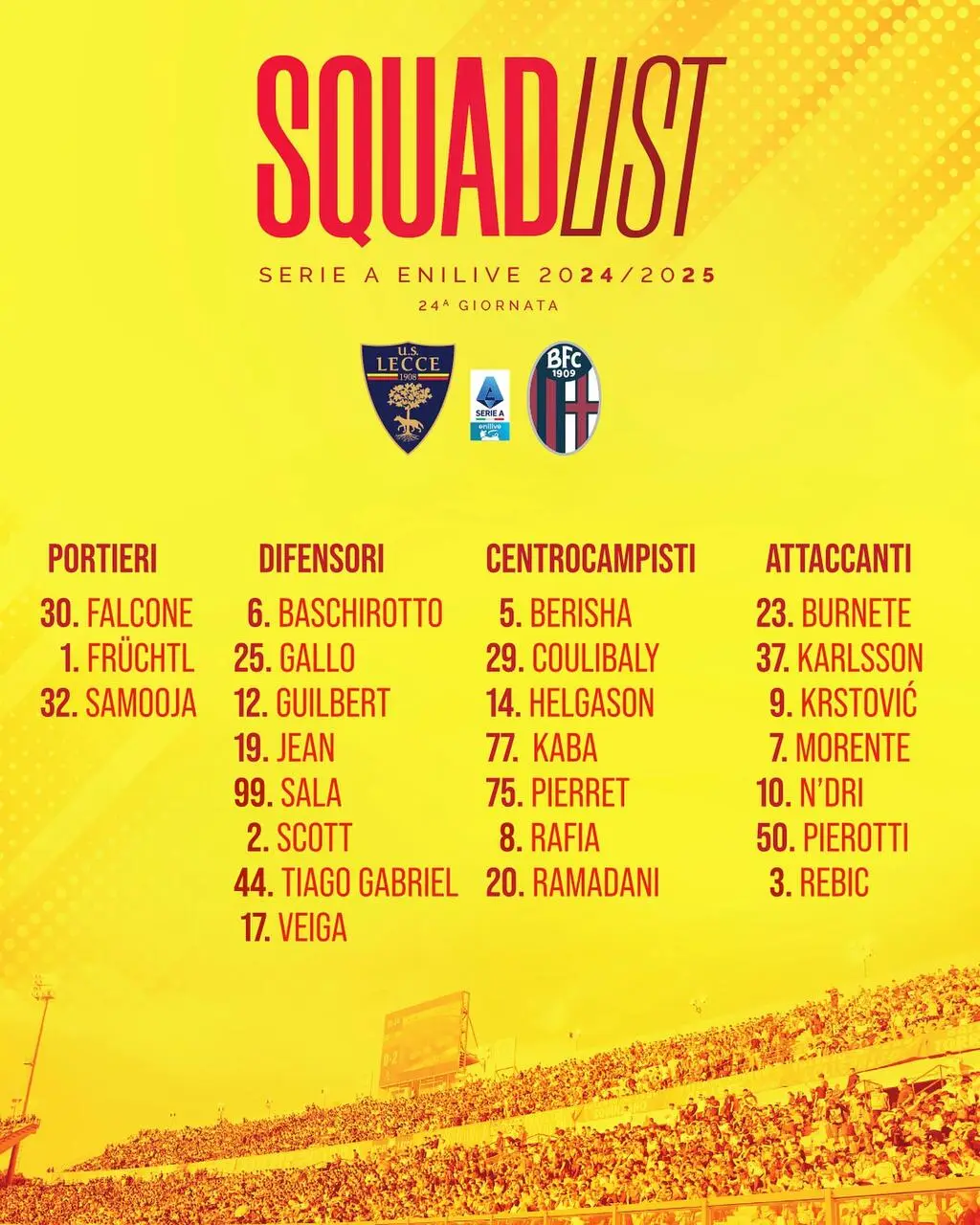 LECCE - Sono 25 i giallorossi che Giampaolo si è portato in ritiro per questo Lecce-Bologna di domani alle 18 al “Via del Mare”.