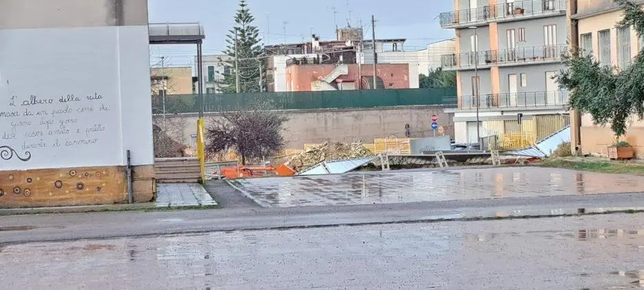 LECCE - L'ondata di maltempo che ha colpito il Salento in questa coda di festività natalizie e il forte vento che ha sferzato in tutto il nostro territorio ha fatto venire giù il cantiere della Scuola dell'Infanzia Scipione Ammirato - Giovanni Falcone a Lecce.