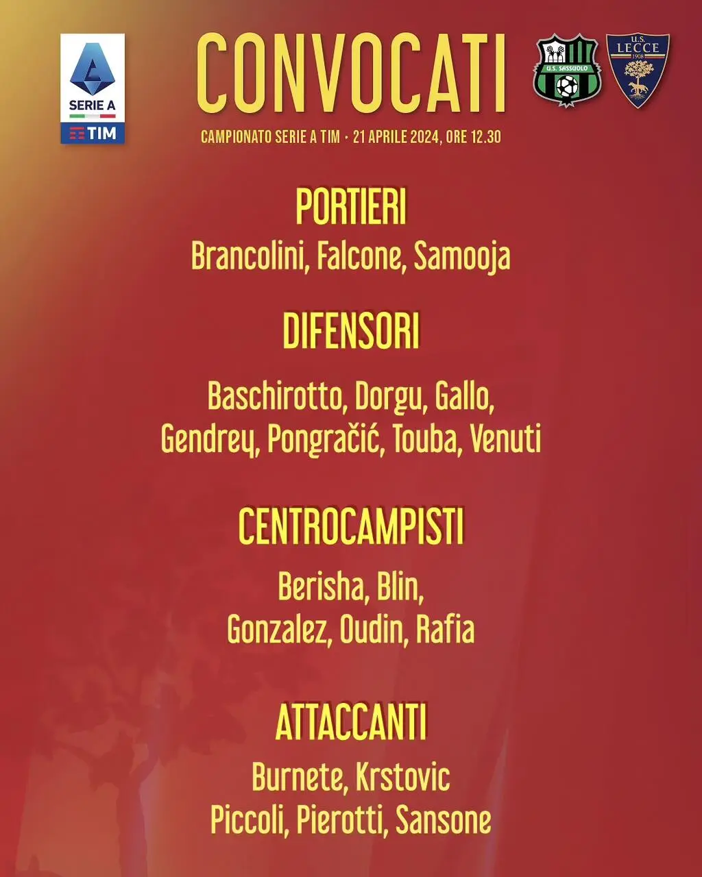 LECCE - Sono 22 i convocati del tecnico Gotti in vista di Sassuolo-Lecce di domani alle 15 al “MAPEI Stadium” di Reggio Emilia.