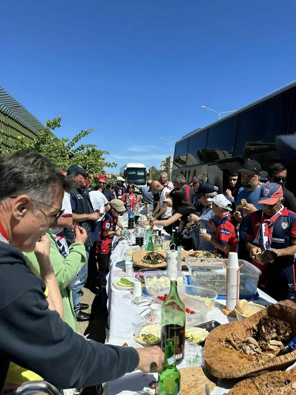 CAGLIARI - Appendice gastronomica e all'insegna della fratellanza e dello spirito conviviale, tra tantissimi tifosi del Lecce e quelli del Cagliari che nel parcheggio della “Sardegna Arena” hanno ospitato i tifosi del Lecce “armati” soltanto di una carrellata di prodotti tipici sardi.
