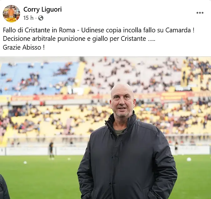 LECCE - Torna sui social per attaccare la classe arbitrale con un significativo “Grazie Abisso” finale al suo commento, il VicePresidente del Lecce Corrado Liguori che paragona e accomuna gli interventi di Bella-Kotchap su Camarda e di Cristante (Roma) ai danni di Karlstrom (Udinese), avvenuti entrambi nell'ultima giornata di campionato.