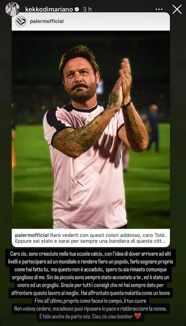 “Sei stato il mio eroe”, il pensiero d'esordio del lungo post affidato a una “stories” su Instagram da parte dell'esterno d'attacco del Palermo (NELLA FOTO SOPRA IL TESTO INTEGRALE).