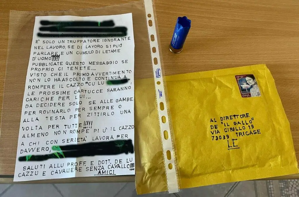 “Le prossime cartucce saranno cariche per lui…, da decidere solo se alle gambe per rovinarlo per sempre o alla testa per zittirlo una volta per tutte”, è il messaggio intimidatorio scritto con un normografo, dunque non da sprovveduti.