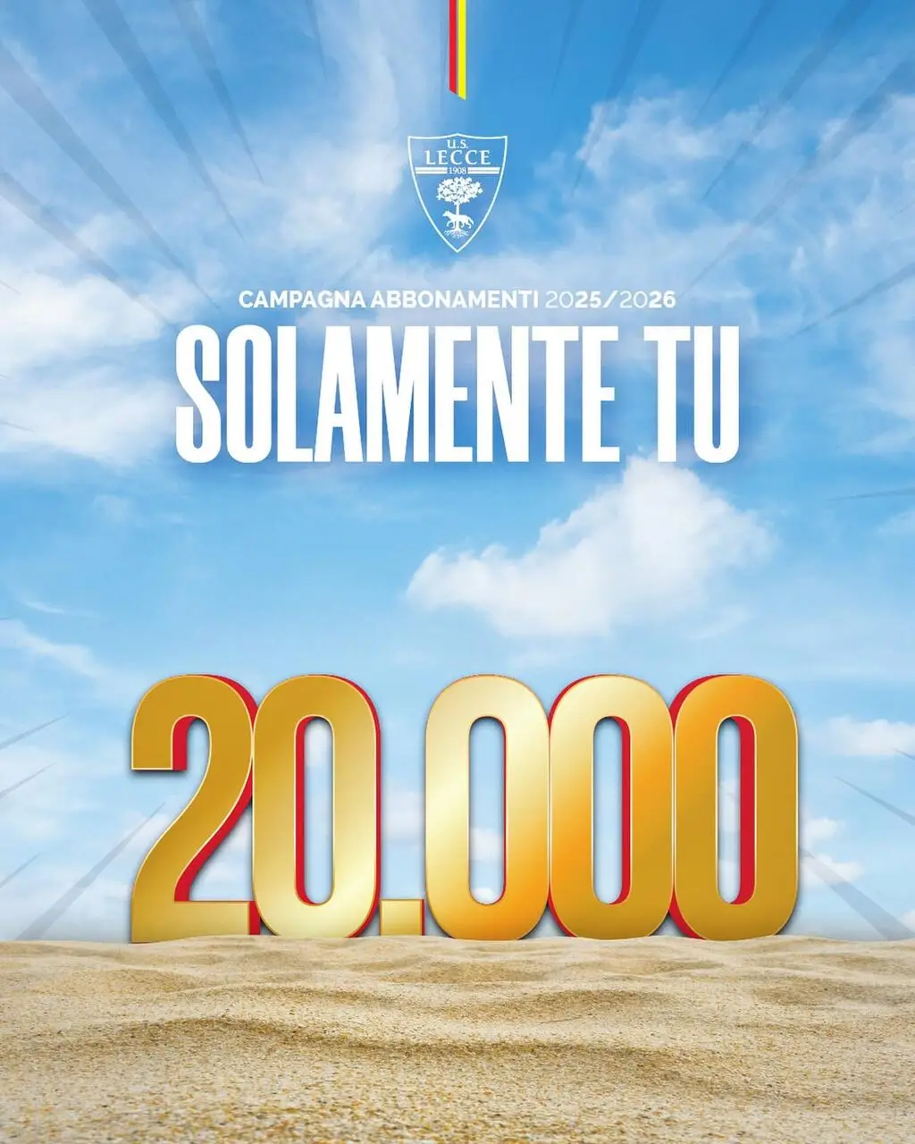 Siamo 20mila nella "tana": il Lecce celebra con una grafica social il raggiungimento dell'obiettivo