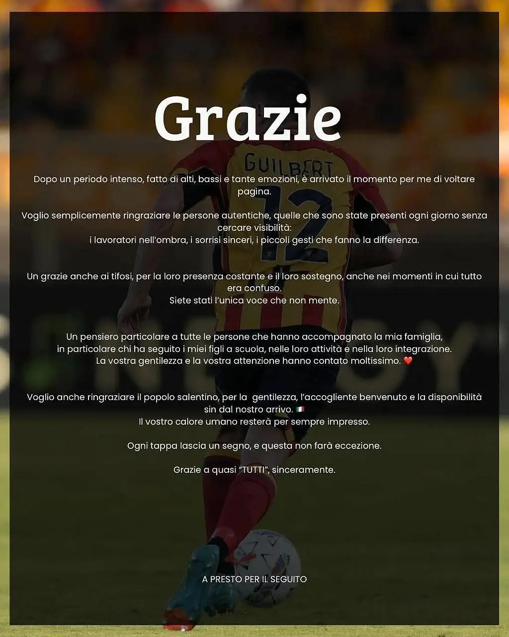 Un addio non indolore, un messaggio di ringraziamento signorile e dedicato a “quasi” tutti i leccesi, come ha puntualizzato nel suo testo social Guilbert che appena svincolatosi dal Lecce ha immediatamente firmato e posato con i suoi nuovi colori (FOTO SOTTO).