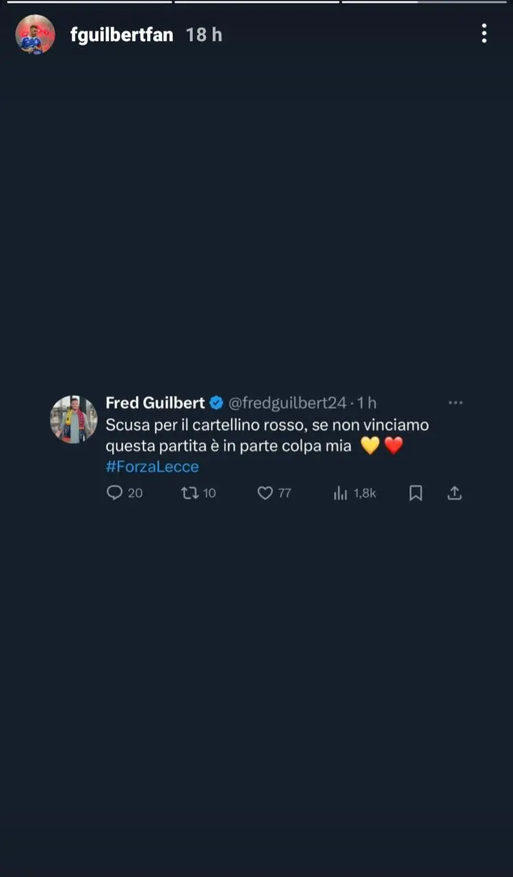 LECCE - Frederic Guilbert chiede scusa: lo fa attraverso i social, con un messaggio pubblicato in queste ore di amarezza dell'ambiente leccese per quanto accaduto ieri con il Parma in quell'incredibile finale di gara.