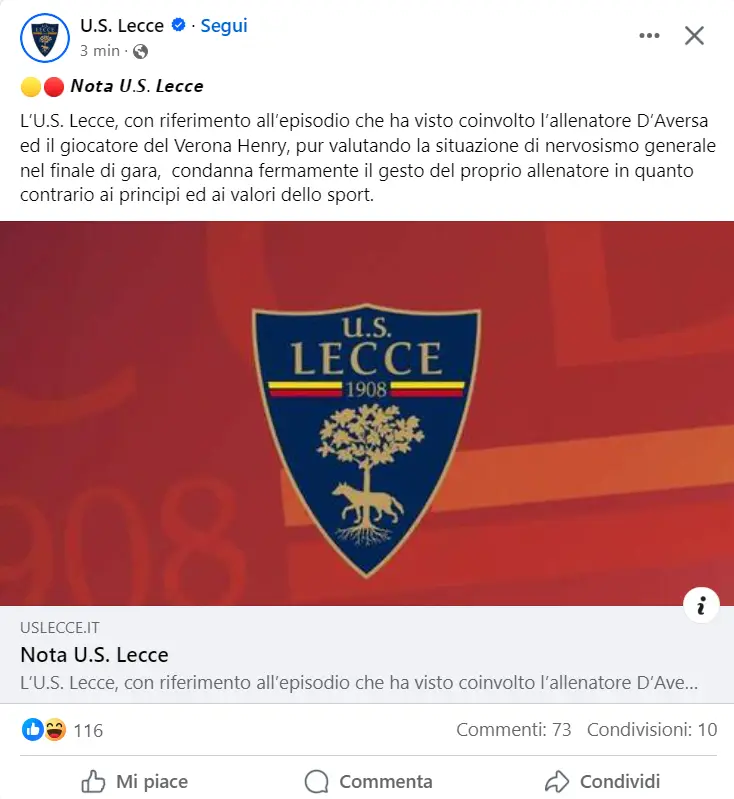 Il post del Lecce, la presa di distanze dal gesto di D'Aversa - “L'Unione Sportiva Lecce, con riferimento all'episodio che ha visto coinvolto l'allenatore D'Aversa ed il giocatore del Verona Henry, pur valutando la situazione di nervosismo generale nel finale di gara, condanna fermamente il gesto del proprio allenatore in quanto contrario ai principi ed ai valori dello sport”.