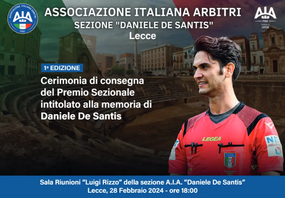 Subito dopo questa iniziativa il Consiglio Direttivo dell'AIA Lecce guidato dal Presidente Paolo Prato ha fortemente voluto l'istituzione del Premio Sezionale intitolato alla memoria di De Santis. Premio che domani sarà consegnato all'Internazionale Daniele Orsato della Sezione AIA di Schio, un nome che non ha bisogno di presentazioni nell'ambiente arbitrale italiano e internazionale (SOTTO LA SCHEDA).