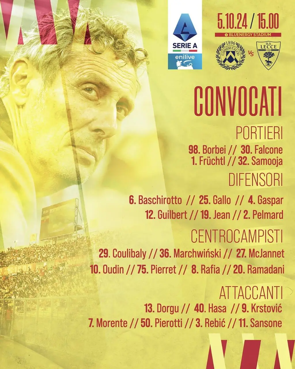 LECCE - Sono 24 i convocati del Lecce in vista della trasferta di Udine di domani alle 15 in casa dell'Udinese di bomber Lucca.