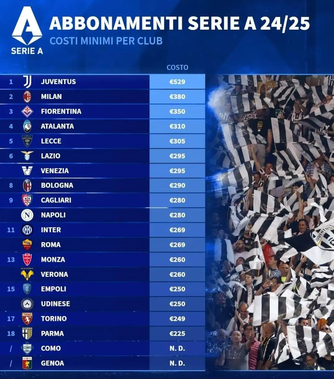 La testata economica "Calcio e Finanza" ha messo in fila il costo medio degli abbonamenti della prossima Serie A