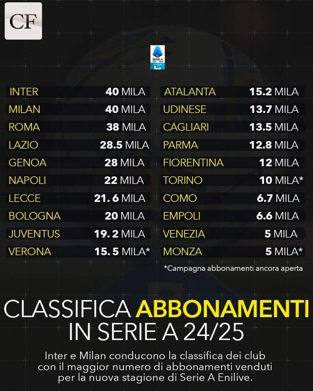 Il Lecce, anche se la campagna abbonamenti di Verona, Torino e Monza è ancora aperta, si mette alle spalle i dati sugli abbonamenti, tra gli altri, di Bologna e Juventus, società dalle frequentazioni in Champions League, e pure la Fiorentina reduce da 2 finali europee di fila.