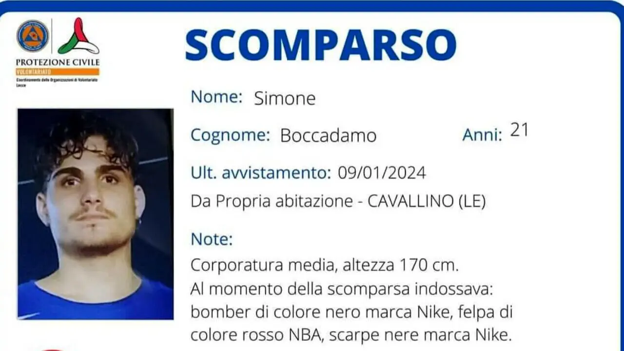 CAVALLINO - Dal pomeriggio di martedì la famiglia di Simone Boccadamo, un 21enne di Castromediano di Cavallino, non ha più notizie del ragazzo, svanito nel nulla.