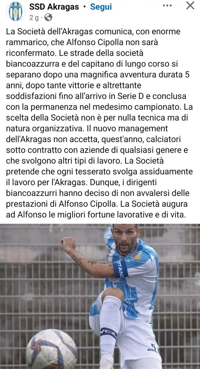 L'Akragas ha messo addirittura nero su bianco questa discutibile ragione del divorzio (Cipolla lavorava anche lo scorso anno, quando non ha saltato un allenamento…), tanto che l'AssoCalciatori sta valutando eventuali profili di discriminazione nei confronti del calciatore.