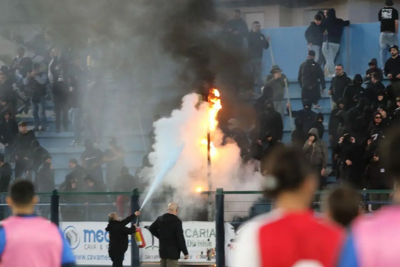 A quel punto il lancio di oggetti che già aveva provocato una sospensione di mezz'ora in precedenza è diventato una pioggia incessante, con i Vigili del Fuoco in campo a “sparare” con gli idranti in direzione del settore Ospiti che stava anche andando a fuoco.