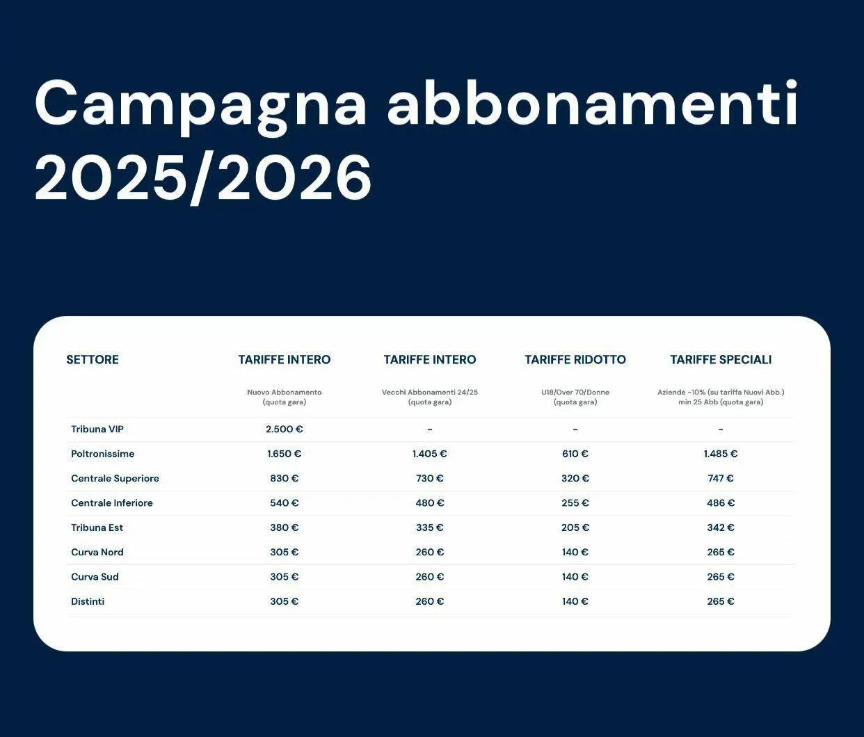 I vecchi abbonati in Curva Nord, Curva Sud e a tutti gli spicchi dei Distinti spenderanno 260 Euro per rinnovare il loro posto, in Tribuna Est spenderanno 335 Euro, in Tribuna Centrale Superiore 730 Euro, in Tribuna Centrale Inferiore 480 Euro. Per confermare il proprio posto alle Poltronissime l'abbonamento costa 1405 Euro.