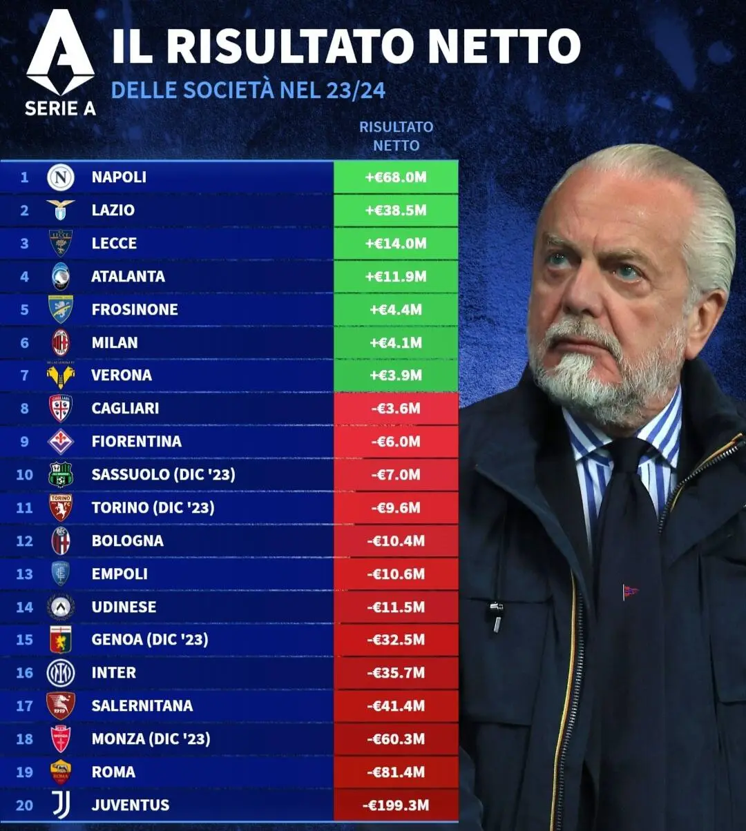 Il Napoli ha vinto lo Scudetto degli utili, con 63 milioni di Euro addirittura di risultato operativo di gestione. Nessuno si avvicina al club di De Laurentiis per guadagni, la Lazio 2° è lontana con 38 milioni e mezzo di Euro di utili (ma i biancocelesti hanno riempito le casse con la Champions League che ora hanno perso per l'immediato futuro).