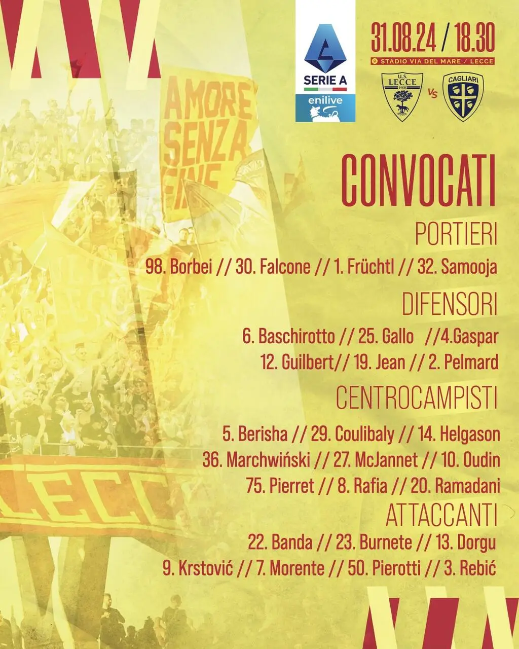 LECCE - Privo del solo Kaba in fase di ricondizionamento atletico dopo l'infortunio della stagione scorsa e degli ultimissimi 2 arrivati Bonifazi e Hasa, il tecnico del Lecce Gotti ha convocato 26 elementi per la sfida di oggi alle 18.30 con il Cagliari al “Via del Mare”.