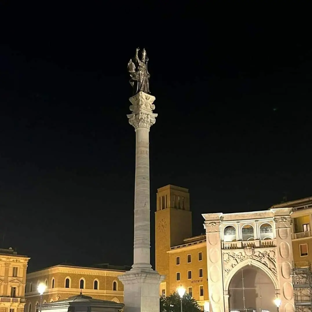 E' stata ripristinata infatti a partire da ieri sera l'illuminazione artistica della colonna romana sulla cui sommità il martire cristiano sovrasta Lecce benedicendo i credenti.