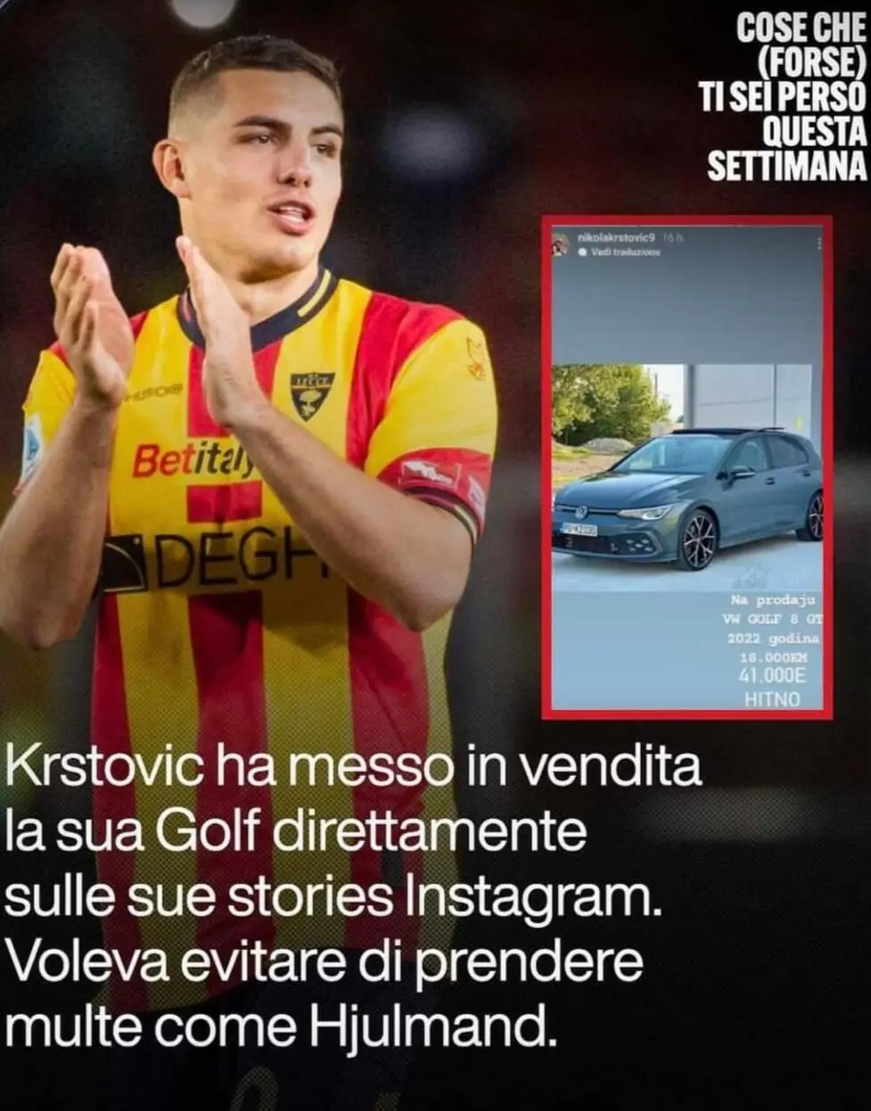 Dopo mesi di tentativi, “stories” Instagram e post (SOPRA, DELL'OTTOBRE SCORSO), è arrivata l'offerta giusta: Krstovic ha venduto la sua GOLF a un leccese, subito dopo ha ritrovato il gol al “Via del Mare” che mancava da ottobre…