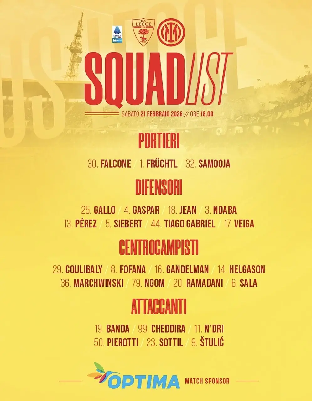 Per il resto lista ampia per il tecnico giallorosso, che ritrova Banda nel reparto offensivo insieme a Cheddira, N’Dri, Pierotti e Sottil. A centrocampo confermate tutte le alternative con Ramadani, Coulibaly e Fofana pronti a giocarsi una maglia dal primo minuto. Difesa reparto al completo ampia disponibilità. Assente da lungo tempo ormai il solito Camarda.