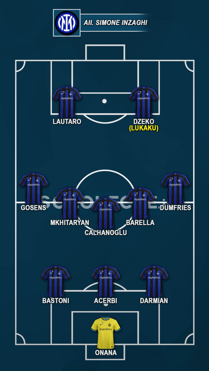 Per il resto davanti a Onana il terzetto dei centrali Darmian, Acerbi e Bastoni. In mezzo Dumfries e Gosens sulle corsie, con Barella, Calhanoglu e Mkhitaryan interni di centrocampo. Davani uno tra Lukaku e Dzeko, come detto, accanto al punto di riferimento Martinez.