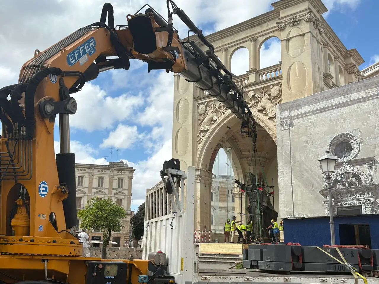 LECCE - Sono in via di completamento in questi istanti le delicate fasi di trasporto dall'androne di Palazzo Carafa, sede del Comune di Lecce, al Sedile di Piazza Sant'Oronzo della statua del Santo patrono della città di Lecce che sta tornando nella piazza che porta il suo nome a vegliare sui leccesi.