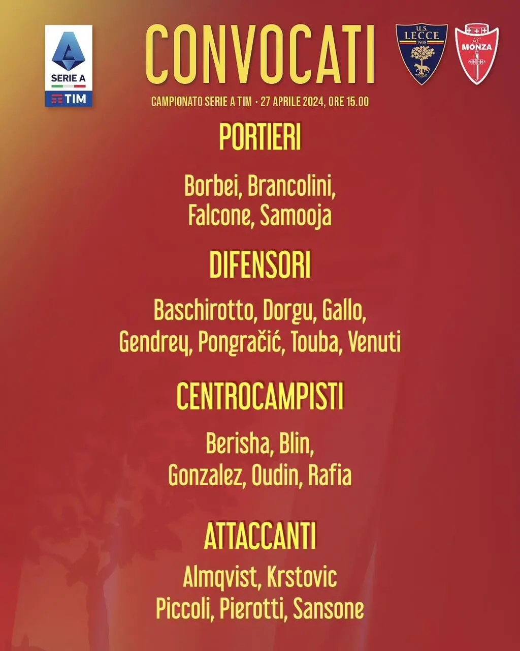 LECCE - Sono 21 i convocati di Gotti in vista di questo crocevia salvezza per il Lecce, la gara di domani alle 15 al “Via del Mare” con il Monza di Palladino che può valere un campionato.