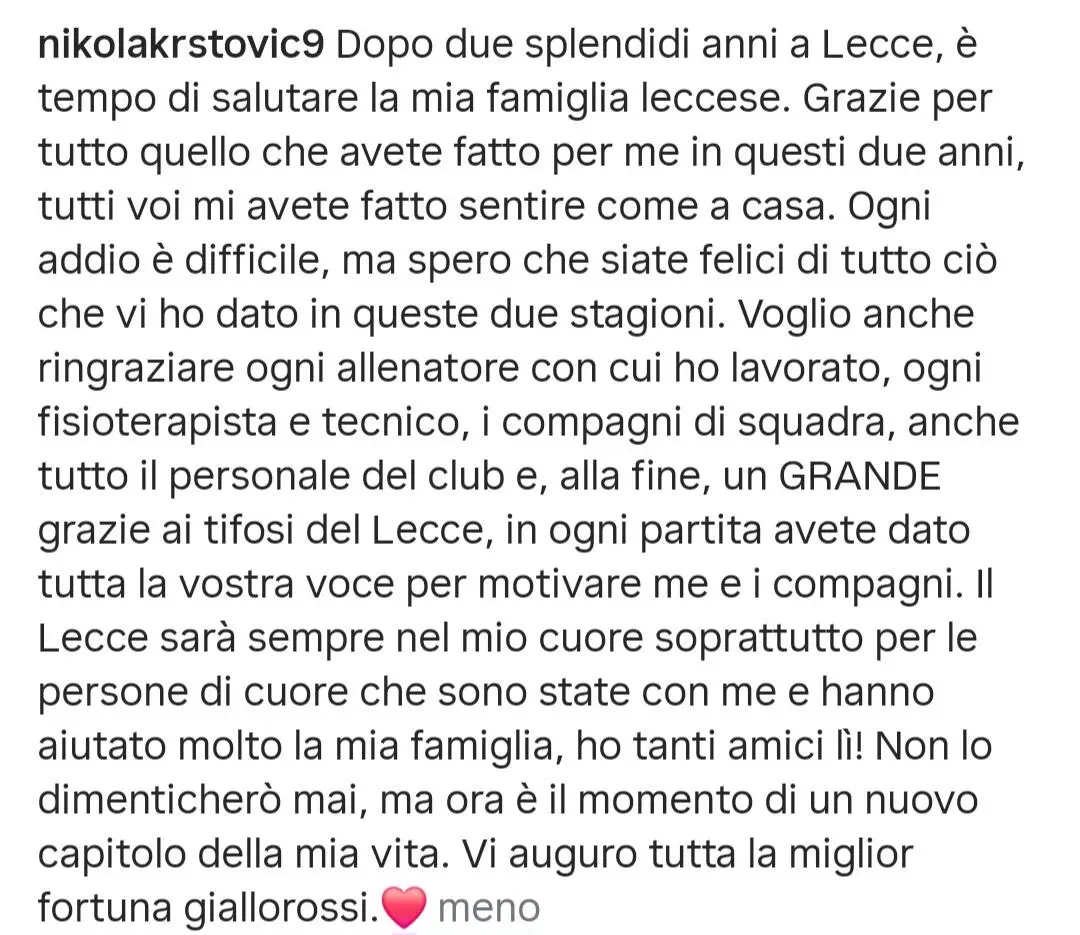 BERGAMO - Al termine di questa lunga prima giornata pienamente da atalantino è arrivato il post di addio al Lecce e al Salento di Nikola Krstovic.