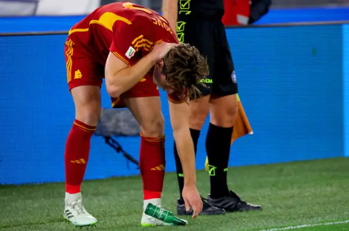 ROMA - Ecco lo scatto più significativo, che da solo vuol dire già tante cose: il centrocampista della Roma Bove è appena stato colpito alla parte alta della spalla da una bottiglia di birra lanciatagli dagli spalti della Tribuna Tevere (la Lazio giocava il derby “virtualmente” in casa, il settore era affidato ai tifosi biancocelesti), al culmine di un Lazio-Roma da battaglia, sugli spalti e in campo (3 espulsi tra i calciatori pure…).